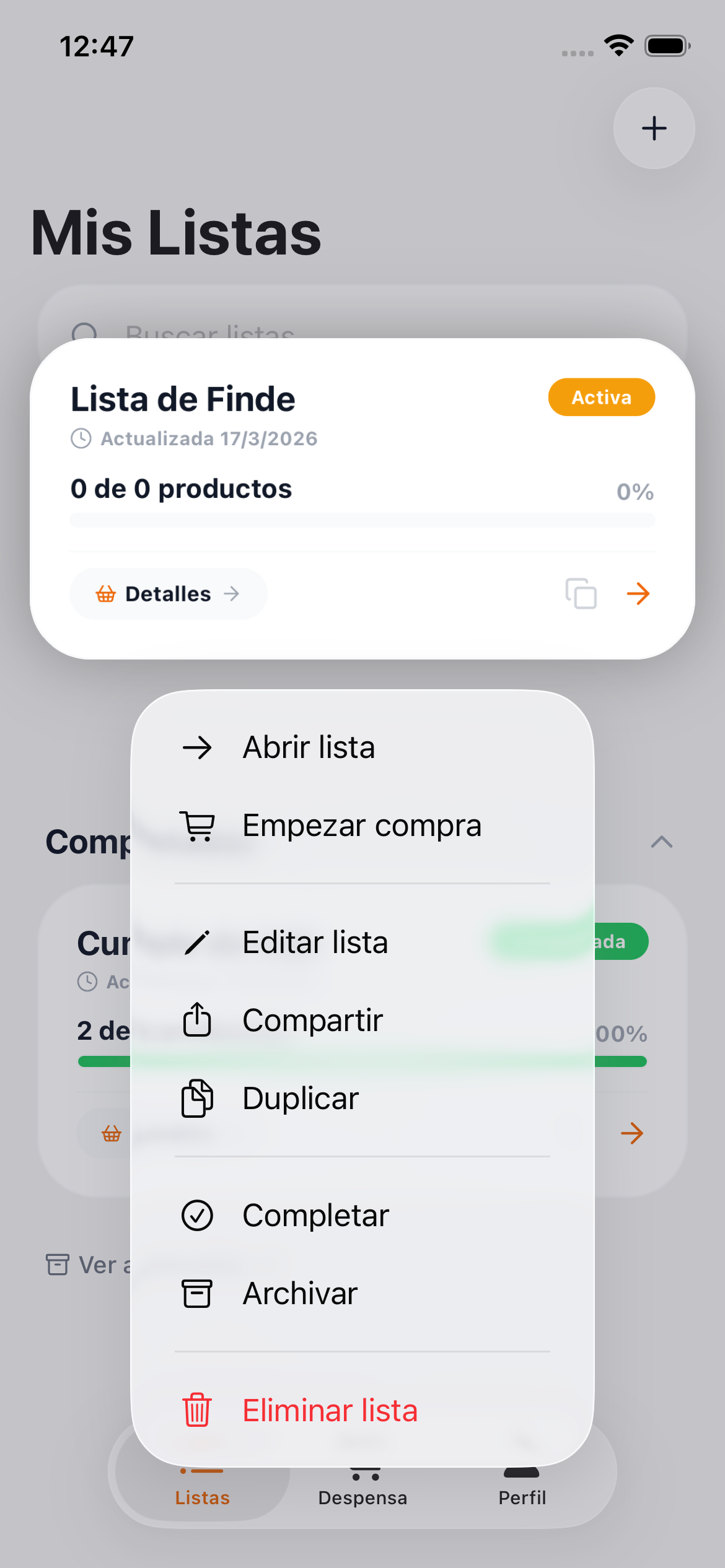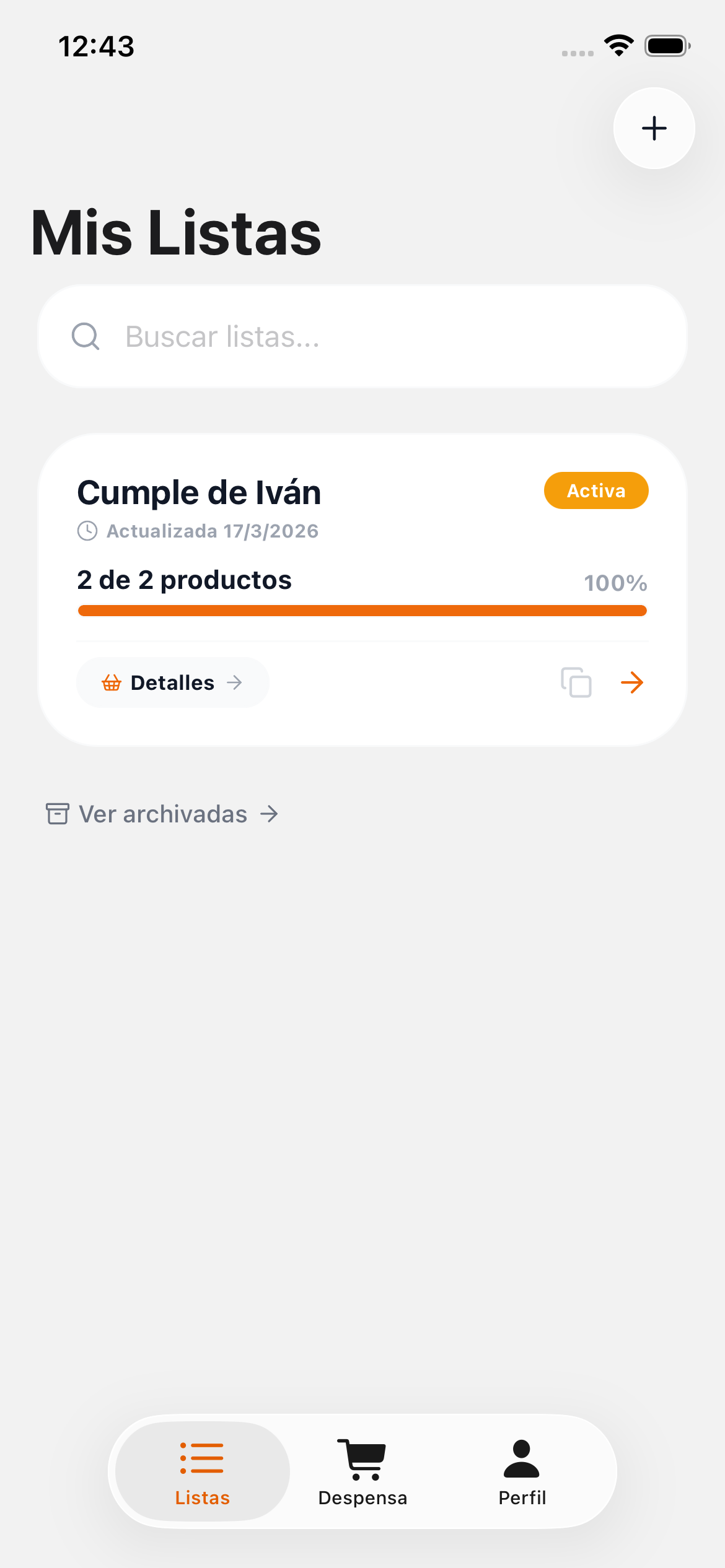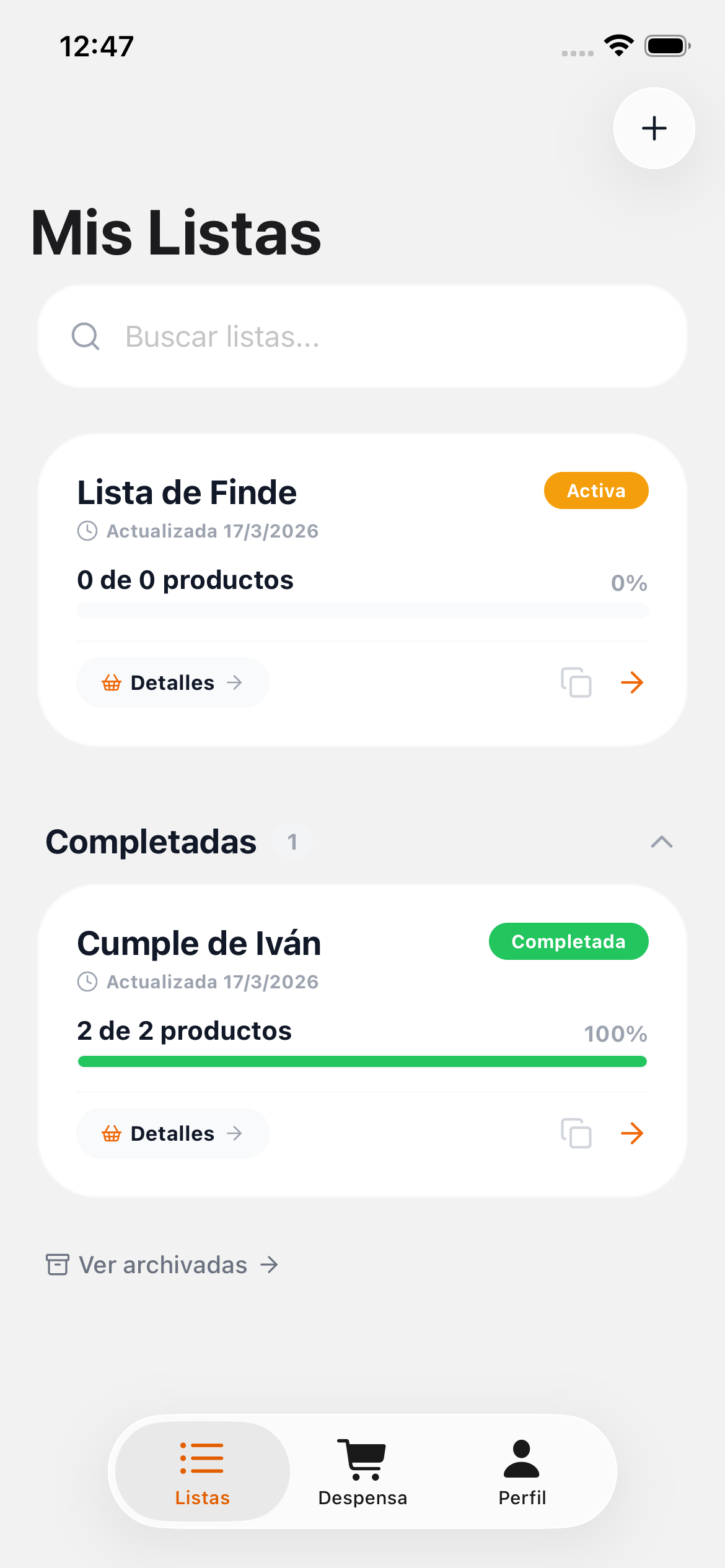 En el listado principal verás tus listas activas y completadas diferenciadas claramente.