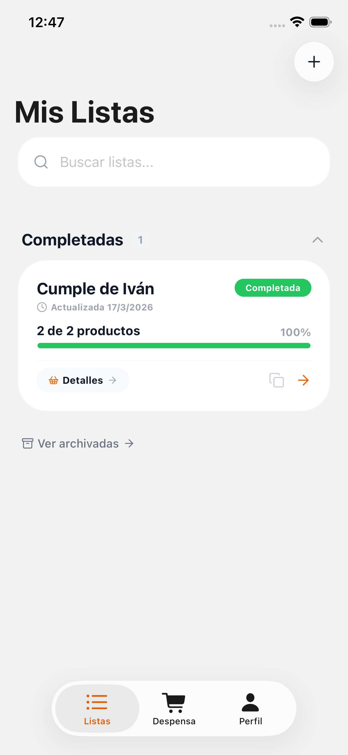 Cuando hayas marcado todos los productos, tu lista aparecerá como completada en el listado principal.