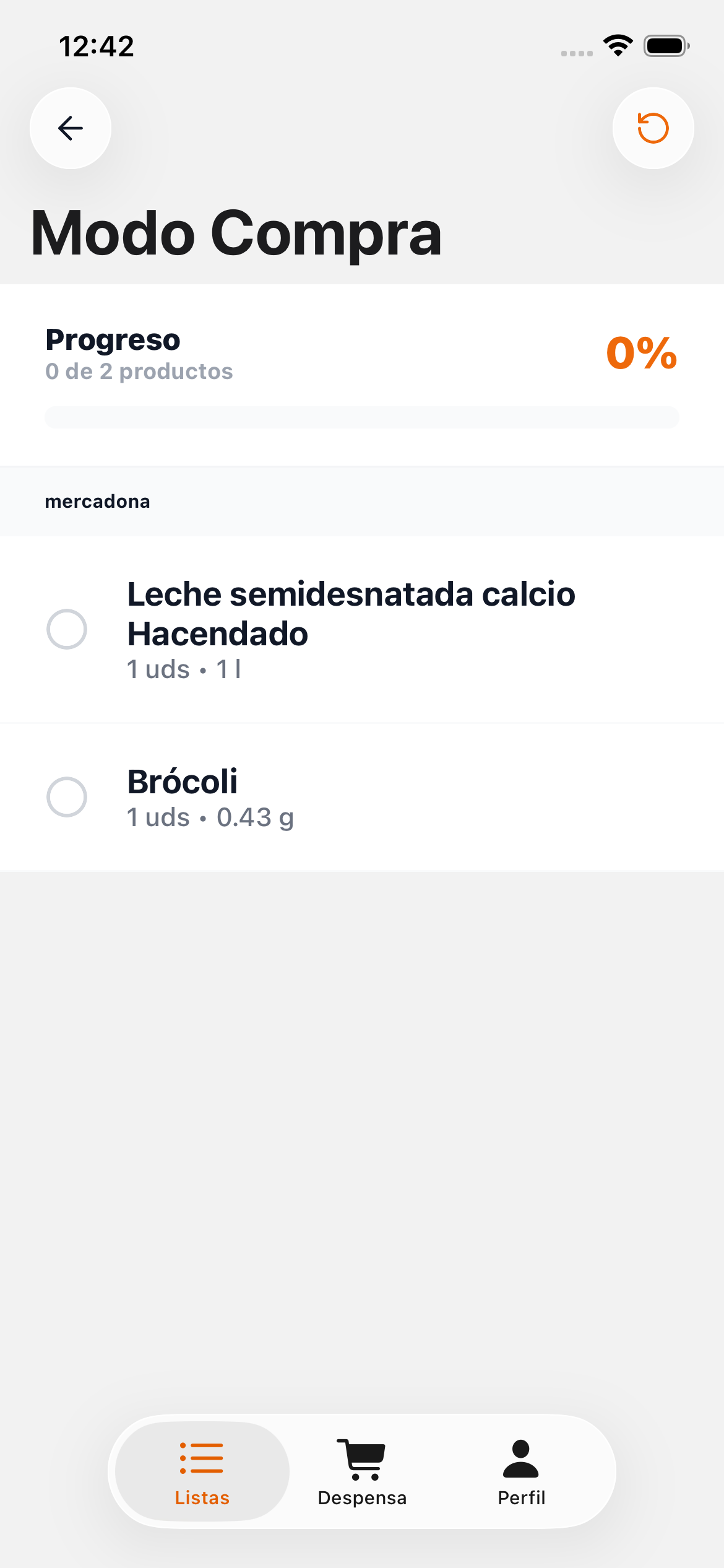 Desde tu lista abierta, toca el botón "Modo Compra" en la esquina superior derecha de la pantalla.