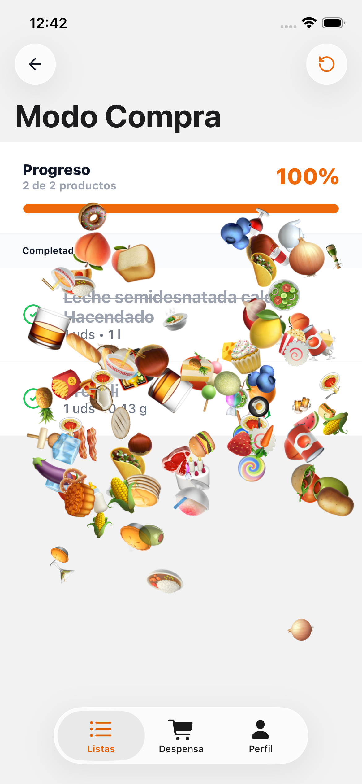 Cuando marques el último producto, la app celebra con una animación de confetti. Sal del Modo Compra con el botón de retroceso para volver a tu lista.